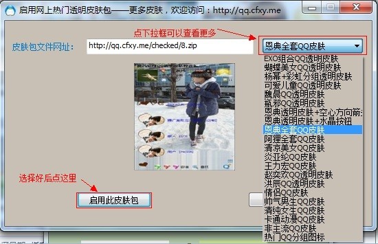 - 先退出QQ客户端,然后在软件界面点击“一键透明”按钮,即可快速应用预设的明星或主题透明皮肤。过程中如有提示,请按提示点击“确定”继续。