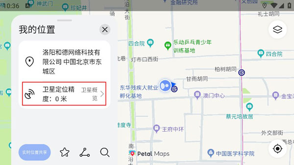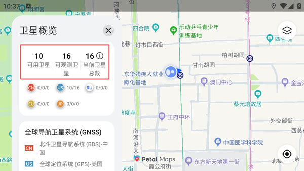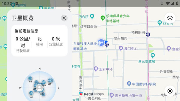 点击地图上的定位标记,除显示当前位置外,还会展示当前卫星定位精度。进一步点击可进入【卫星概览】页面,实时查看已连接卫星数量、可观测卫星列表及定位状态,适合户外或高精度定位需求场景。