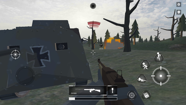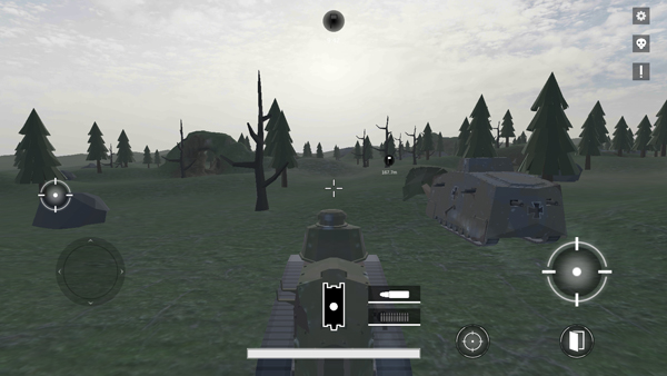 四、进入战场后,默认以坦克第一人称视角展开。左侧虚拟摇杆控制移动,右侧按钮用于开火;血条旁为瞄准镜。特别值得注意的是,主炮发射后需等待5秒装填,期间可点击下方小子弹图标切换至机枪模式。炮弹飞行轨迹遵循真实物理抛物线,击中目标前可清晰观察弹道下落过程,物理引擎表现相当出色。
