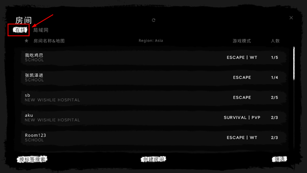 2. 在房间列表中选择“在线”选项,即可加入其他玩家创建的公开房间;