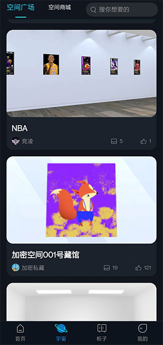 4、点击底部“柜子”入口,查看个人藏品、空间装扮及收藏记录;
