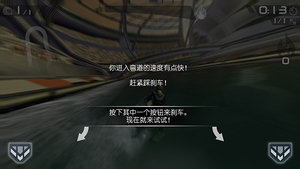 - 刹车:界面设有两个刹车按钮,任意点击均可减速,适用于弯道精准控制;