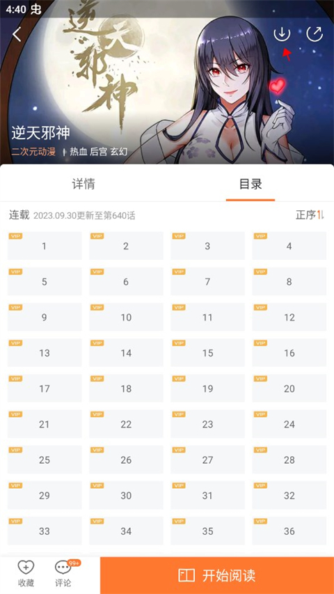 1、在漫画阅读界面,点击右上角的下载按钮。