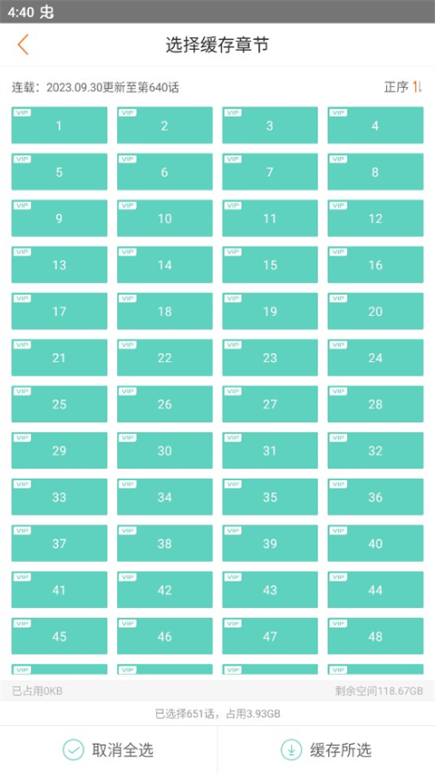 2、勾选需要缓存的章节,点击右下角“缓存”按钮开始下载。