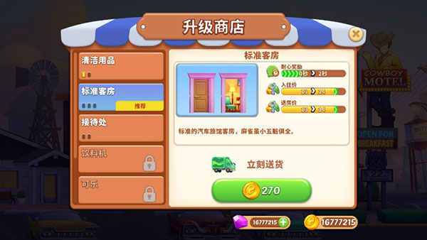 持续升级关键设施:使用闯关所得资源强化厨房、前台、客房等核心区域,显著提升整体运营效率与接待能力。