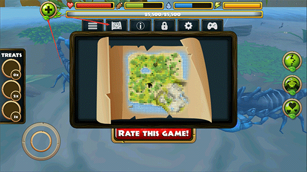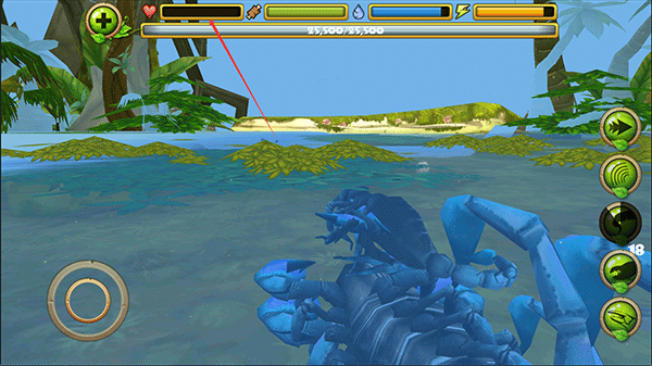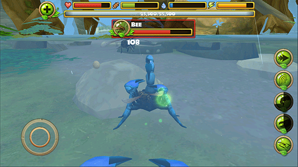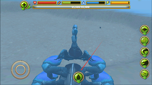 3. 在探险途中,你可以对蜻蜓、青蛙、蛇类、鸟类等猎物发起攻击。右侧功能键依次对应:加速、眩晕、尾刺攻击、钳击以及进食操作,精准配合才能高效捕猎。