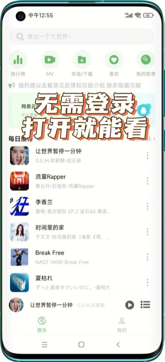 5. 无需登录即可畅听:操作逻辑简洁直观,即使未注册或登录账号,也能直接搜索、播放和下载歌曲,随时随地开启音乐之旅。
