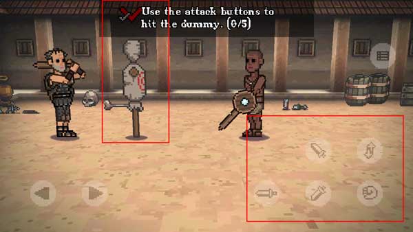 4、实战演练环节,使用剑配合右侧按钮攻击木桩,完成后即结束教程。