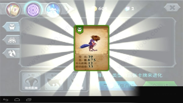 点击界面顶部的紫色多面体球体进入合成界面。界面分为三大类别:直立行走、爬行类、飞行类。每次合成需至少三只同类型动物。例如,可尝试组合两只老虎与一只犀牛。