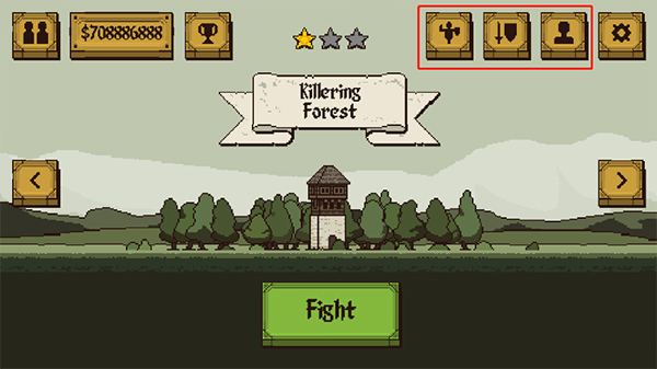 - 点击屏幕中央“Fight”按钮即可进入战斗。顶部菜单依次为训练场、武器库和角色设置;