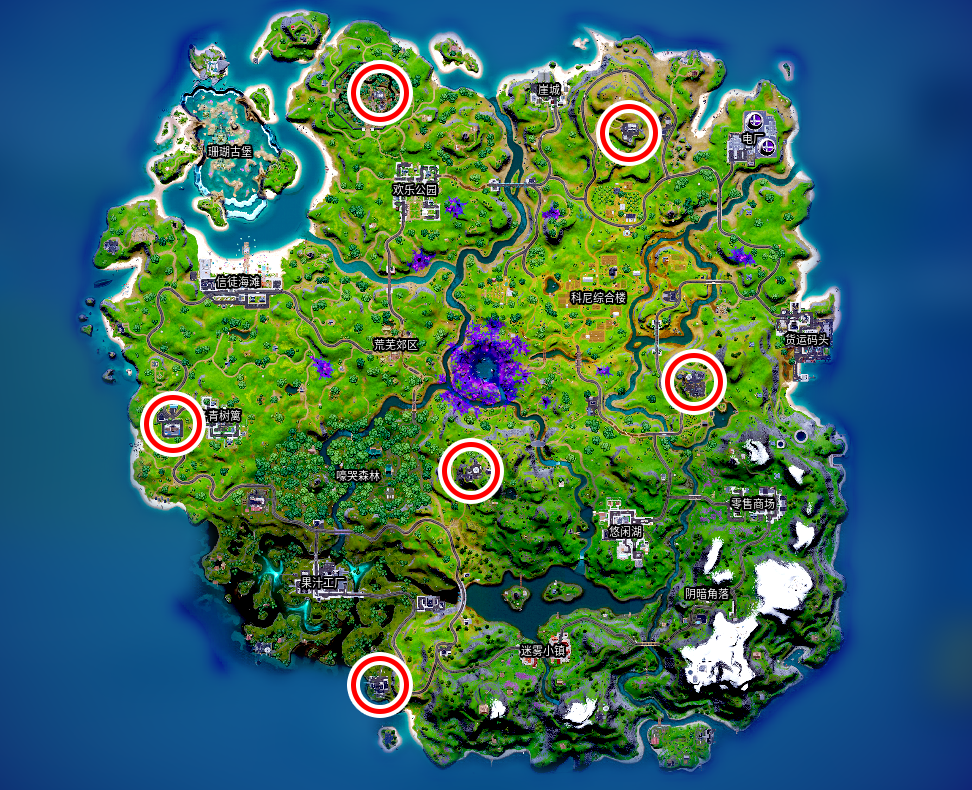 五个间谍基地位置如下图所示。“阵营锁定宝箱”指被封印的箱子,需通过电话亭变身或击败附近守卫后扫描方可开启。