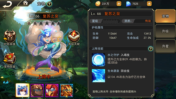 1、复苏之泉(金色):入场时提升全体己方防御力,持续两回合;回合技为群体治疗,特别适合缺乏奶妈的阵容,显著增强续航能力。