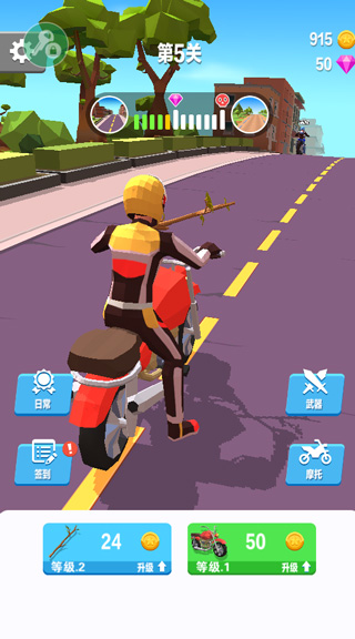 2、提供多达45款性能不同的摩托车,涵盖强度、武器槽位、起跑速度等多项参数,支持自由选择与策略搭配。