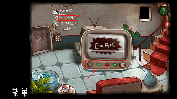 26. 回到楼下,打开电视并调整按钮与旋钮,使其与墙上显示一致,获得信息:E = A + C。