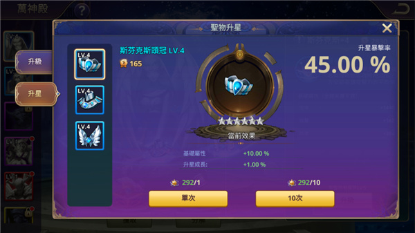 圣物部件支持升星操作,材料为星魂石。每颗星分为八个阶段,完成第八阶段后提升一星。每个阶段均带来属性增长。升星过程存在暴击进度机制,但随星级提高,暴击率逐渐下降,所需星魂石数量亦递增。
