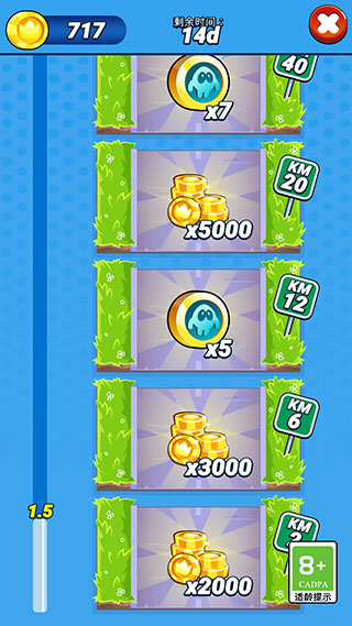 2、使用多种强化道具:包括火箭推进器实现瞬间加速、弹跳靴飞跃高障、磁铁自动吸附金币、双倍金币道具提升收益,助你一路狂奔无阻。