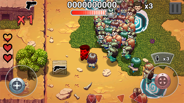 初始状态下你只能使用威力较弱的手枪,攻击大型敌人效率较低。但当你击败特定僵尸后,有机会获得更强大的装备,例如炸弹、电锯、机关枪等强力武器。如上图所示,当你拾取到【炸弹】后,右侧操作区会出现“X5”的标识,表示你已拥有5个炸弹。点击该图标即可投掷炸弹,对大范围敌人造成毁灭性打击。
