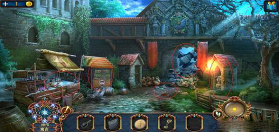 进入左侧城门入口,在右侧门处取得国王权杖,地上拾取一本古书;点击左侧两个物体,分别获得生长药水配方和金属材料。
