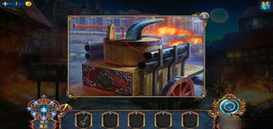 开局先拾取地上的黑色物品,在右侧门上取得喷水装置,并从雕像下方获得铲子。使用扇形钥匙启动机关,获取阀门部件,将其与喷水器组合后安装在水车上,用于扑灭火焰。