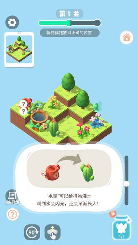 4、使用水壶为植物浇水,植物喝饱水后会发出闪光并逐渐成长;所有装饰与植物均可自由拖动摆放,不需要时还能回收利用。