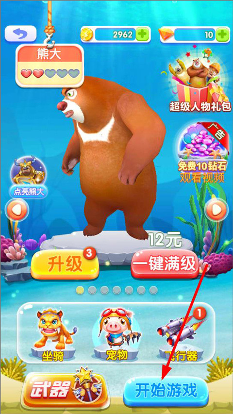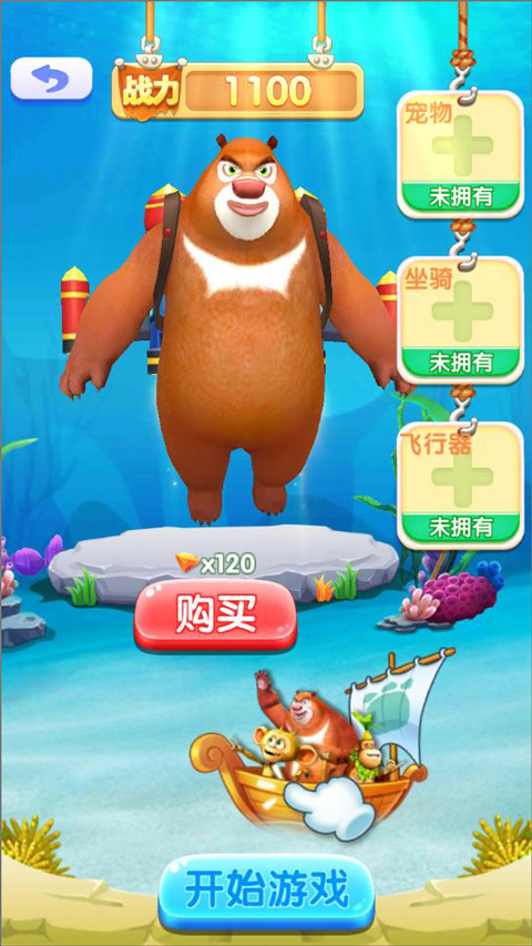 2、在角色选择页面,可使用金币升级角色或购买新装备、坐骑、宠物及飞行器,配置完成后再次点击“开始游戏”;