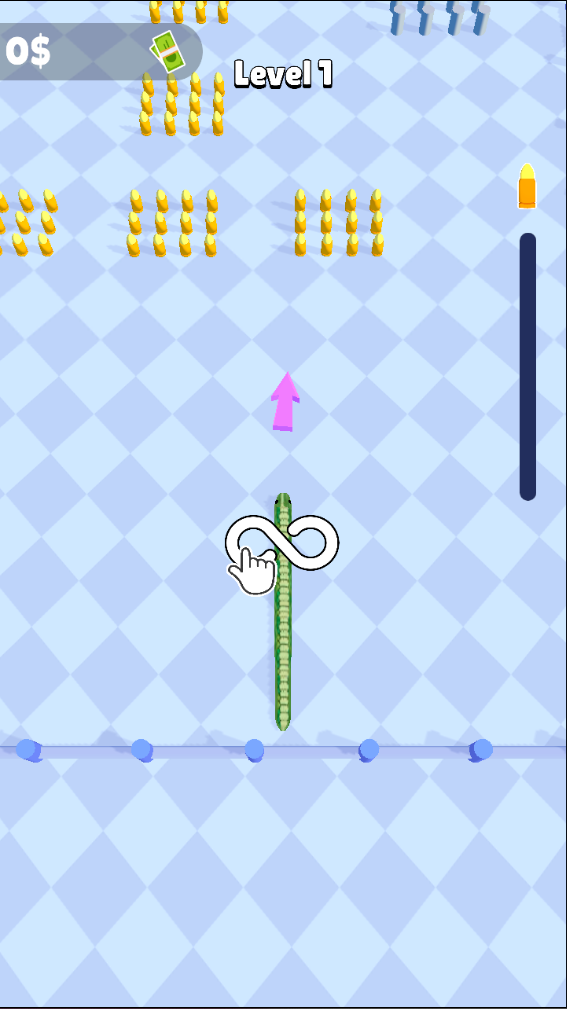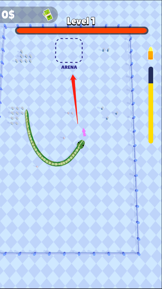 2、通过旋转屏幕控制贪吃蛇移动,主动寻找并吞食金黄色的子弹道具以提升攻击力。