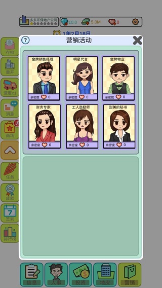 一切准备就绪后即可开工。进入营销界面,激活秘书与鼓励师功能,可使建造速度提升至原来的四倍。接近完工时,继续招聘两名专家级销售人员,并使用钻石解锁额外销售岗位。随后在营销系统中多次启用金牌销售策略,加速资金回笼。(温馨提示:当钻石储备充足时,应尽可能多地解锁建造师与销售岗位,以全面提升项目效率。)按此流程操作,可顺利迈入稳定盈利阶段。