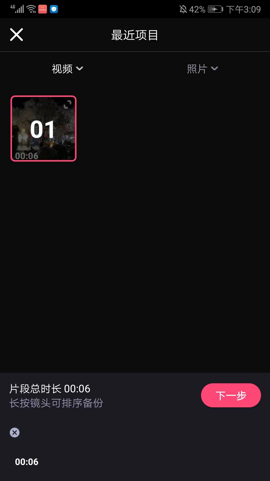 2、从相册中选择需要编辑或发布的视频片段,确认后点击【下一步】继续。
