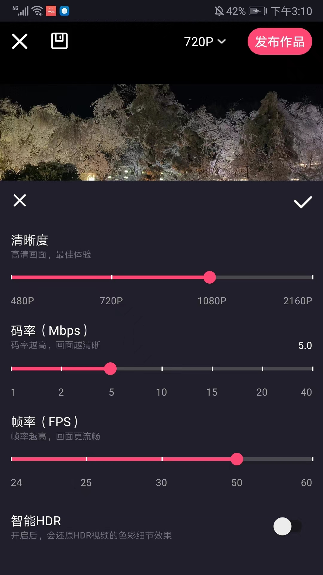 5、编辑完成后,点击右上角当前清晰度标识(如【720P】),在弹出窗口中可切换至1080P、4K等更高画质及60帧高帧率选项,确保输出质量。
