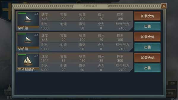 6、进入“舰队详情”页面,可以查看所有战舰信息,支持加装火炮或一键出售操作;在“造船厂”中则可用金币打造更高级别的舰只。