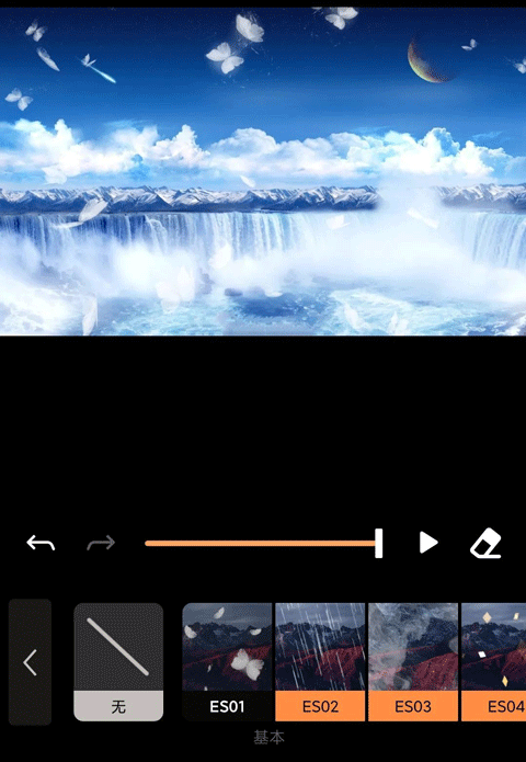 6、进入“覆层”功能,选择“ES09”特效添加飞舞蝴蝶效果(也可选用其他特效)。编辑完成后,点击右上角“导出”按钮。