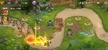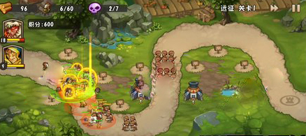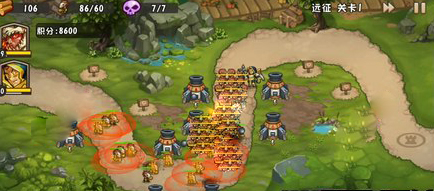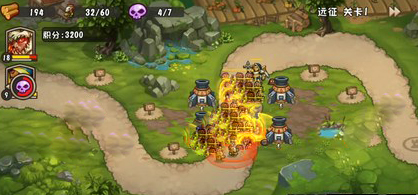第二波:将后方火炮升至三级。这一轮出现了兽人勇士和更多地精医生,民兵难以抵挡,怪物大量涌向第二支部队。此时可使用火雨技能清理聚集的敌人。