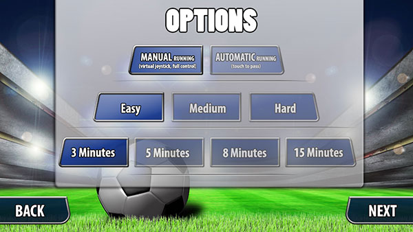 3. 选定队伍后进入“options”设置界面,可调节奔跑方式(自动或手动)、游戏难度及单场时长。